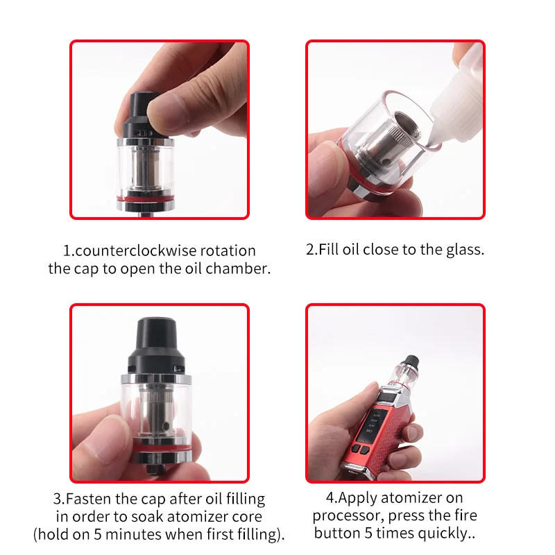 لا تعمل السلطة قبل ملء النفط في رذاذ ، يرجى عقد على 5 دقائق عندما ملء النفط الأول أو استبدال الأساسية رذاذ جديد ، وإلا فإن جوهر رذاذ سوف تتلف.